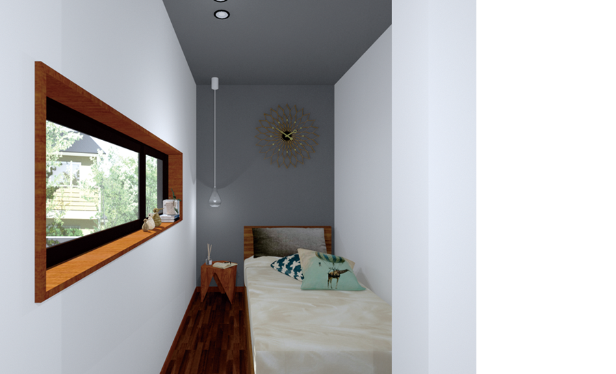 壁の一部と天井を同じグレーのアクセント色にすることで空間を広く感じられます。